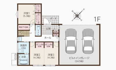 間取り:4LDK+書斎+パントリー+ビルトインガレージ