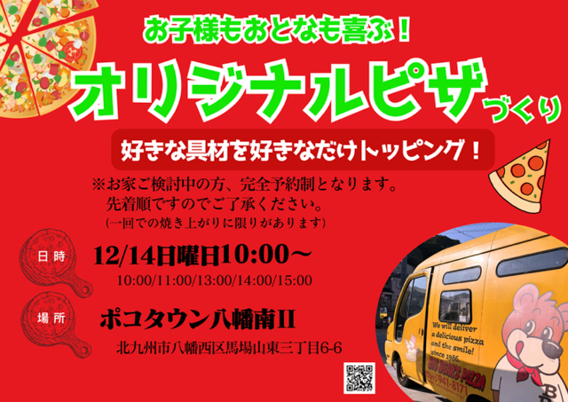 もうすぐクリスマス!クリスマスにもぴったりなピザづくり、好きな具材をトッピングできちゃいます!ビッグベアーズさんのキッチンカーがやってきて、作ったピザを焼きましょう。