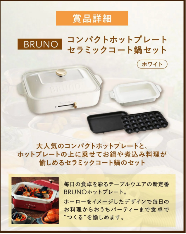 2025年9月1日〜9月30日の期間中、東宝ホーム北九州のInstagramフォローキャンペーンに参加すると、抽選で人気の BRUNOコンパクトホットプレート+セラミックコート鍋セット が当たります!✨