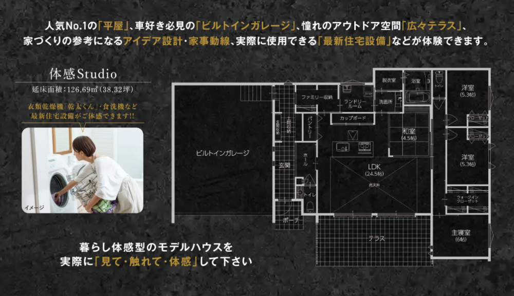 動線設計にも工夫があり、例えば脱衣所と洗面所を分けた間取りや、畳スペースを設けたリビングなど、日常生活に寄り添った提案が満載です。 収納の位置や使いやすさなども、実際に確認することができます。