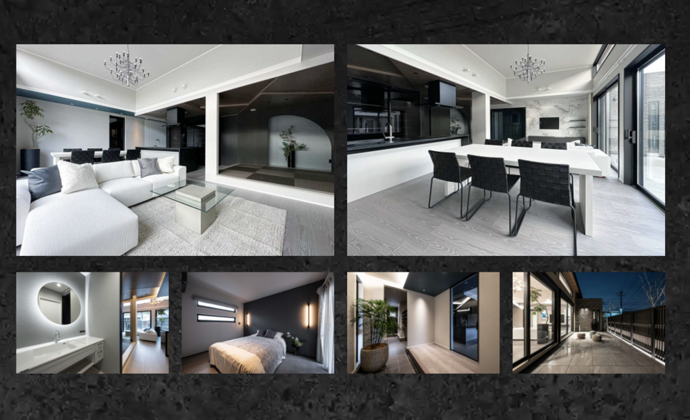 平屋でガレージ付き、タイルデッキや大開口の窓など、非日常を感じられるリゾート感が特徴です。 ナチュラルカラーで統一された家具や内装は、まるで高級ホテルのような落ち着きと気品があります。
