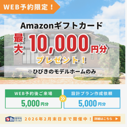 新日本ホームズさんの ひびきのモデルホーム にて、以下の条件を満たした方を対象に Amazonギフト券をプレゼント!