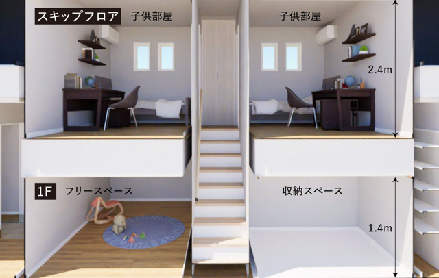 わずか8段の階段で行き来できるスキップフロア構造は、家族の気配を感じながらもほどよい距離感を保てる工夫です。