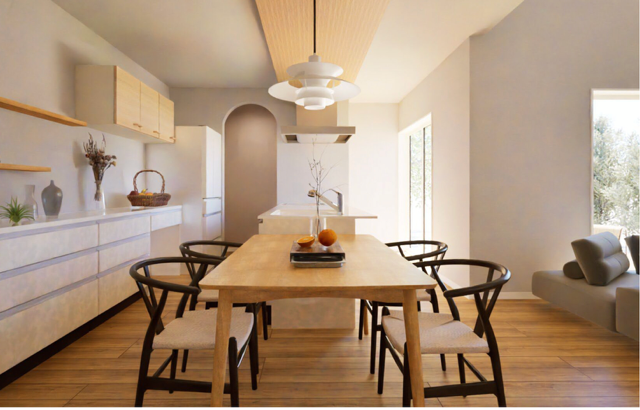 明るい日差しが差し込み、ウッドデッキへ自然につながる設計は、外と内を緩やかに結ぶ心地よい空間です。