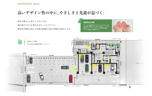 エントランスやパーキング、エレベーターホールなど敷地内の随所に高性能の防犯カメラを設置。入居の皆さまはもちろん、愛車を守るセキュリティも万全です。