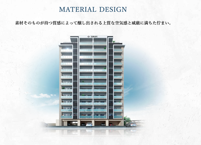 前面開放のランドプランにふさわしい シンメトリーデザイン を採用し、縦に伸びるマリオンとワイドなガラス手すりバルコニーが重厚感と軽やかさを演出しています。